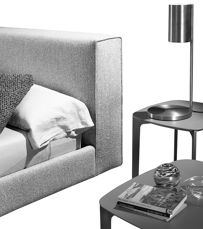 The Alchemy bed with a contemporary grand headrest of imposing dimensions may be used as a stand-alone piece, featuring the padded horizontal line of craft stitching on the reverse. Piping on the extremes formalizes the shape of the headboard which contrasts with the apparent simplicity. A pure minimal approach of form where the strength of the headrest counteracts the slim frame surrounds. This comfortable bed will adapt to all modern interiors.