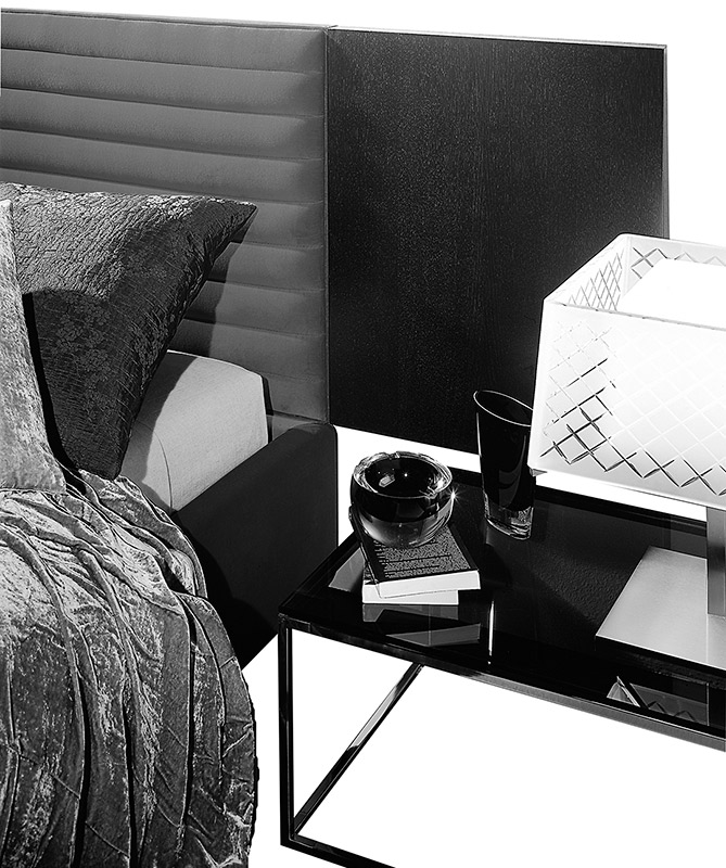 The Alma bed collection consists of headboards, frame for slats and sideboards. Headboards are available in different measures (height and length). The upholstered frame allows two different types of height regulation: · telescopic feet allow to raise the whole bed. · the height between slat and frame can be adjusted according to the type of slat. The Alma bed is suitable for articulated and electric slats. Sideboards are available in veneered wood or upholstered.
